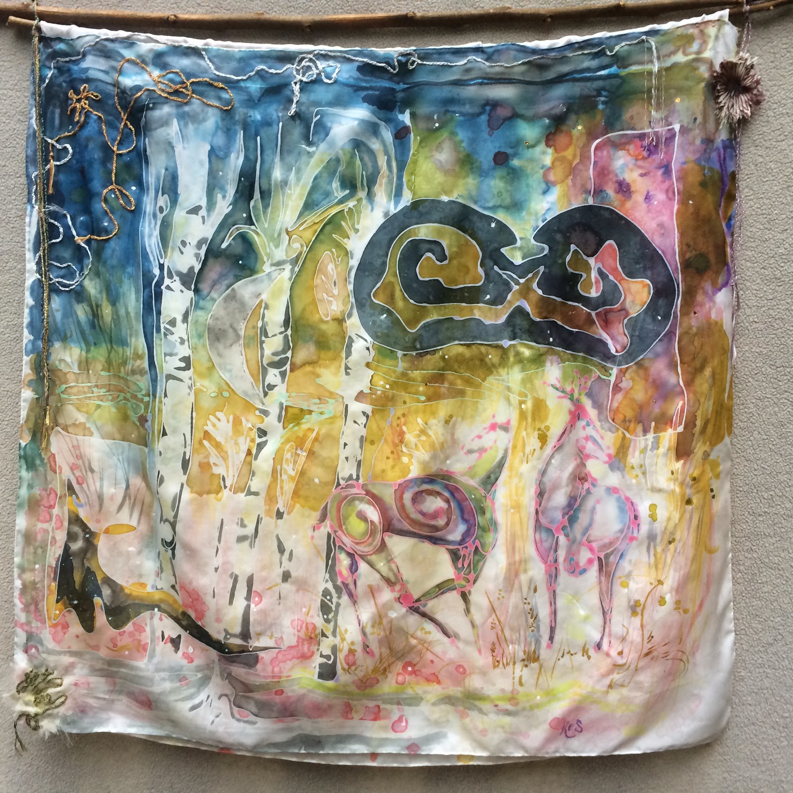 the finished piece is called ' patronus '. it is sewn onto sumac branches-they look like fuzzy deer antlers. fabric elements are couch stitched on the front painting layer. there is a second painting sewn underneath. embroidered on the bottom left corner are the word's 'lift me'. the thread has a tail, for the viewer to lift and reveal the under layer. JK Rowling fans know the meaning of the word 'patronus'. it is a charm/spell that is able to conjure an incarnation of the caster's innermost positive feelings, such as joy or hope. enjoy.