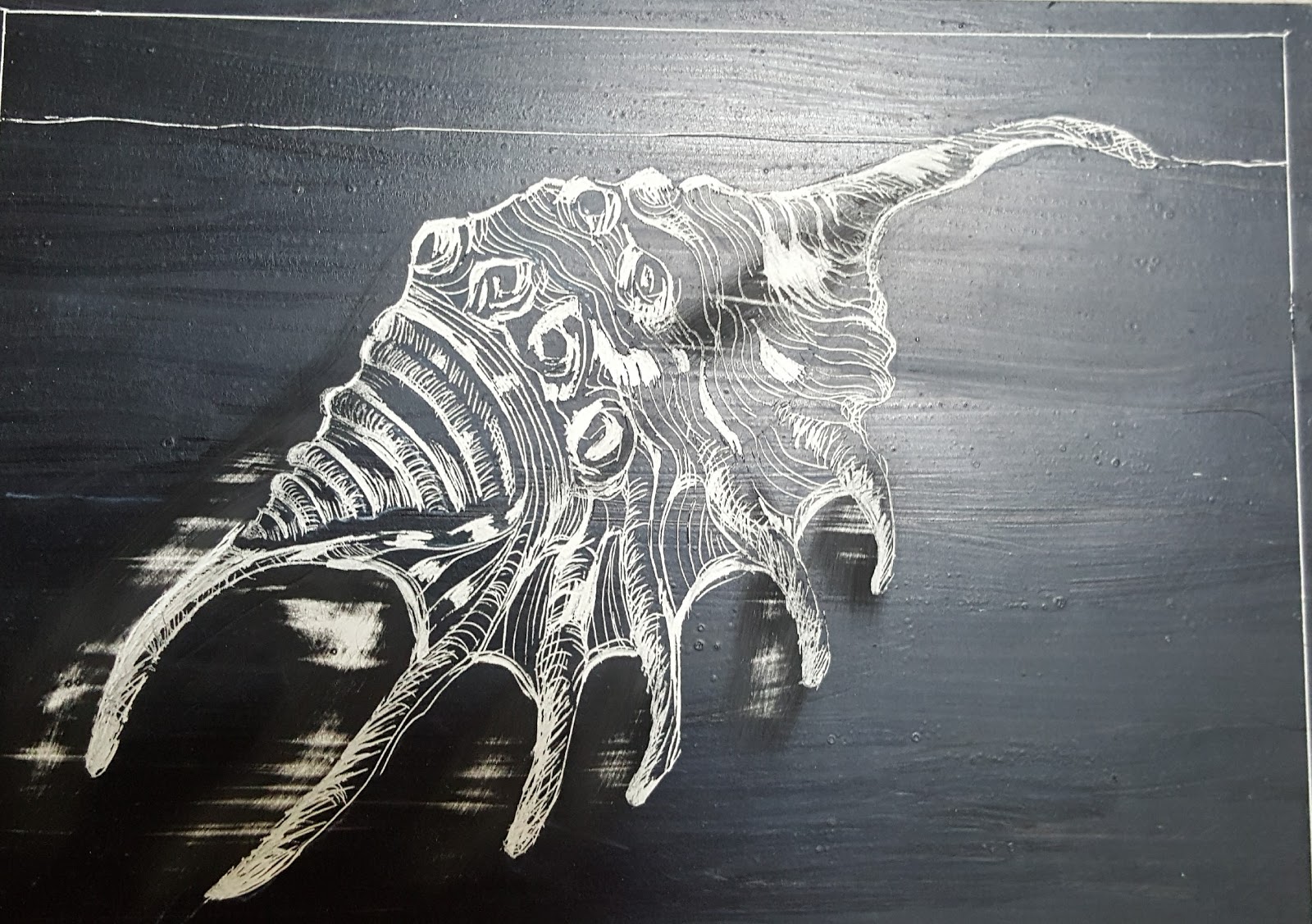 | Scratchboard, Still life (the object on the left is a horseshoe crab) |
